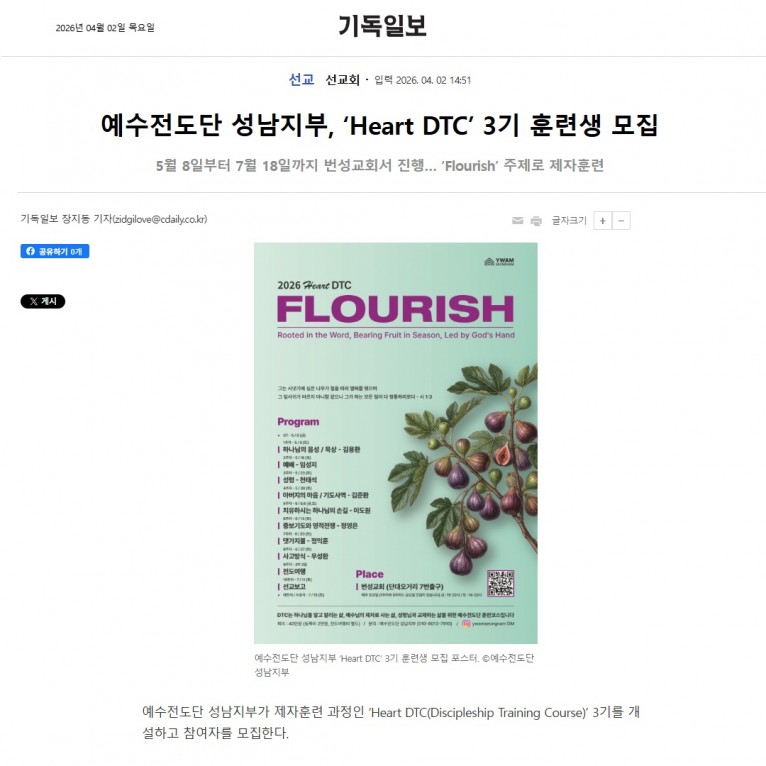 [기사] 예수전도단 성남지부, ‘Heart DTC’ 3기 훈련생 모집(기독일보)